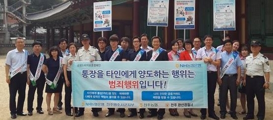 NH농협은행 전주완주시군지부(지부장 류정용)와 전주농협(조합장 박서규) 임직원들은 지난 26일 전주완산경찰서의 협조를 얻어 유동인구가 많은 전주객사 앞, 차 없는 거리 주변에서 전화금융사기와 대포통장으로 인한 피해를 막기 위해 대포통장 근절 및 보이스피싱 피해예방 캠페인을 벌였다.