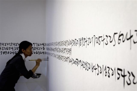 이번 전시는 흰색 한지로 도배된 벽을 캔버스 삼아 먹물로 숫자를 가득 채운 작업이다.