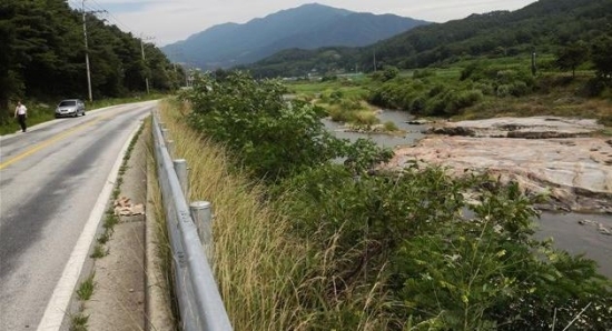 ▲ 전북도갖이성계 프로젝트’를 추진하고 있는 가운데 도로 밑 계곡에 있는 피바위가 관광객들의 접근이 어려워 개선책 마련이 요구되고 있다.