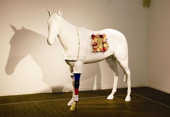 꿈꾸는 현대인을 재치있게 풍자하는 이호철 작가는 돈키호테의 애마였던 로시난데를 전시장에 데려왔다. 야위고 볼품이 없던 로시난테와는 달리 그는 실물크기에 가깝게 미끈하고 잘생긴 백마를 만들었다. 말의 한 가운데 조화(造花)로 장식한 치우천왕을 문장(紋章)처럼 단 백마는 근육과 핏줄까지 사실적이다. 그는 ‘꿈꾸는 자가 오는도다’라는 제목처럼 이상을 향한 인간의 의지를 말에게 투영했다.