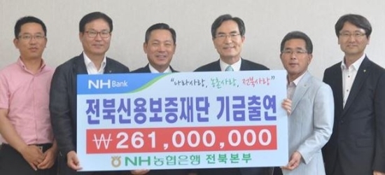 NH농협은행 전북본부(본부장 박태석)는 22일 전북신용보증기금을 방문, 담보력 부족과 자금조달에 어려움을 겪고 있는 전북지역 중소기업과 소상공인을 지원하기 위해 전북신용보증재단(이사장 이상준)에 2억6100만원의 기금을 출연했다.