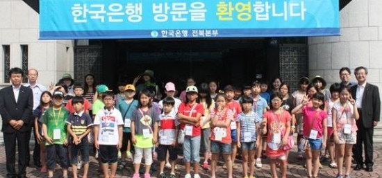 한국은행 전북본부(본부장 신원섭)는 지난 5일과 6일 이틀간 전주시 드림스타트센터 학생 90명을 초청, 은행 견학행사를 갖고 기념촬영하고 있다. 이번 행사는 한국은행의 기능과 역할, 재미있는 화폐이야기 등을 주제로 한 경제교육과 전북본부 영업장 및 금고 견학, 2014 별난물건박물관 전주특별전 관람 등의 프로그램으로 진행됐다.