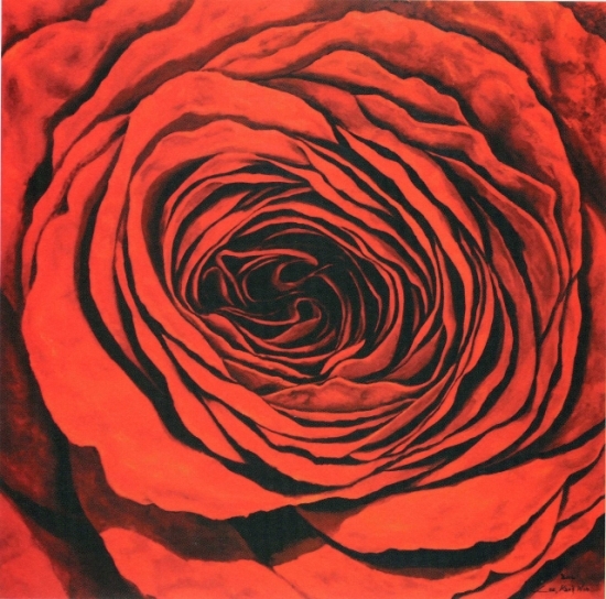 그는 켜켜이 말린 장미 꽃잎을 위에서 내려다 보고 확대했다. 둥근 꽃잎이 말리고 접혀 생긴 주름 사이로 어둠이 드리우고 그 깊이에 따라 입체감이 드러났다. 빛이 흘러 들어온 붉은 부분과, 나가는 검은 부분의 색 대비가 선명하다.