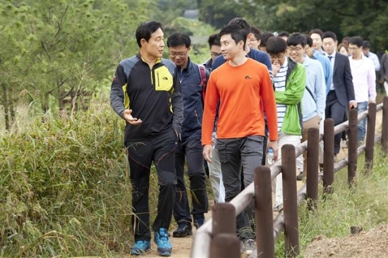 김 회장은 지난달 18일에도 하나은행, 외환은행 직원을 비롯한 그룹 관계사 직원 100여명과 북한산 둘레길 가을산책에 나서 직원들과 자연스러운 소통의 시간을 가졌다.