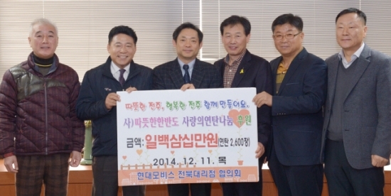 현대모비스 전북대리점협의회가 ‘사랑의 연탄 나누기 운동’에 참여해 11일 연탄 2600장에 해당하는 성금을 (사)따뜻한 한반도 사랑의 연탄나눔운동 전주지부에 전달했다.