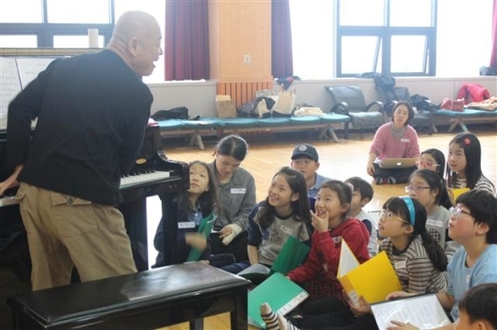 ▲ 임동창 풍류피아니스트가 어린이들과 아리랑 노래를 부르고 있다.