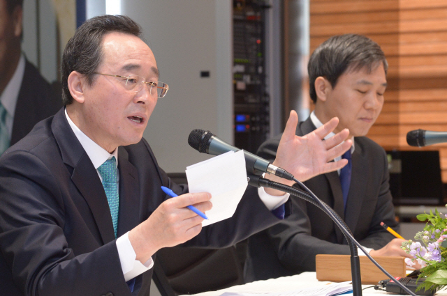 ▲ 민선6기 도·시군간 상생 협력 강화와 주요 현안정책 등을 도민과 함께 공유하기 위해 12일 전주시를 방문한 송하진 도지사가 김승수 전주시장과 함께 전통문화전당 4층 회의실에서 시정보고를 받고 인사말을 하고 있다. 안봉주 기자