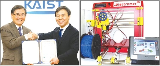 ▲ 전주시와 한국과학기술원의 업무협약식이 지난달 26일 대전광역시 KAIST 본관 1층 회의실에서 열린 가운데 김승수 전주시장과 강성모 총장이 협약서를 체결하고 기념촬영을 하고 있는 모습(왼쪽)과 대림화학에서 개발한 3D프린팅 기기.