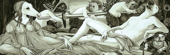 갑옷을 모두 벗은 채 잠이 든 마르스를 비너스가 마주하며 보는 구도를 지닌 이탈리아 화가 보티첼리의 ‘비너스와 마르스’의 얼굴은 아프간 하운드로 변했다. 마르스의 갑옷과 투구를 장난감 삼아 노는 반인반수 사티로스는 불독이 됐다.