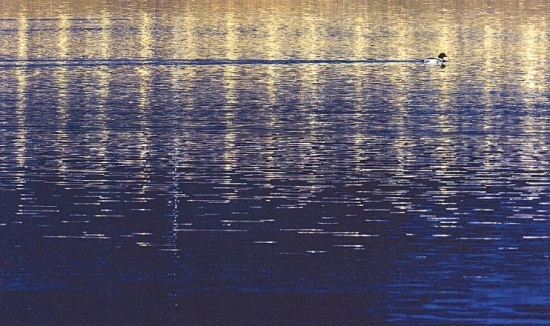 인내와 기다림으로 생태사진을 찍어온 안봉주 사진기자는 이번 전시에서 ‘그 시간’을 주제로 했다. 자연에 아로새겨진 시간의 그림자를 렌즈에 담았다. 윤슬이 비치는 물 위에 긴 고랑을 만든 새의 움직임으로 순간의 흔적을 포착했다.