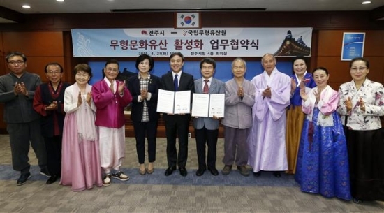 전주시와 국립무형유산원은 21일 시청 회의실에서 김승수 전주시장과 최맹식 국립무형유산원장, 무형유산 전문가 등 50여명이 참석한 가운데 ‘무형유산 활성화를 위한 업무협약’을 맺었다.