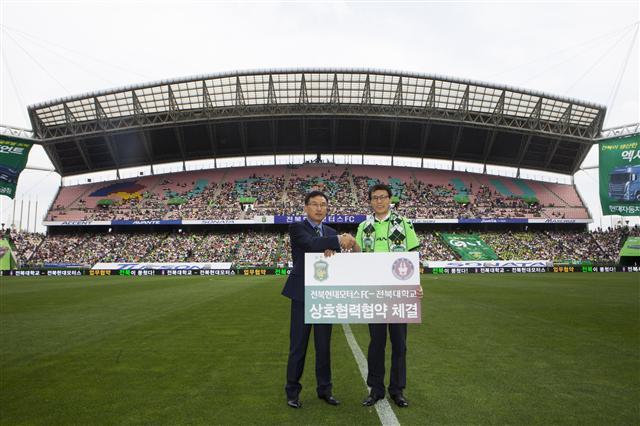 이날 협약에 따라 전북대는 학생 중심의 전북현대모터스 서포터즈를 구성해 응원하고, 전광판 등 대학이 갖고 있는 홍보매체를 이용해 전북현대 경기 일정 등을 알리는 역할도 맡기로 했다.