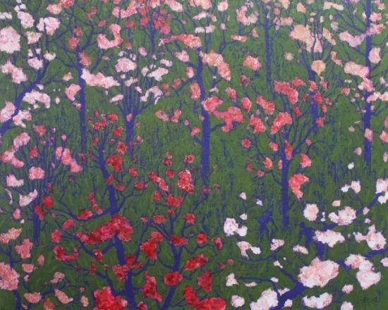 이들은 만개한 꽃과 신록의 푸르름을 그림으로 전한다. 국승선 작가는 생동하는 봄의 기운을 분홍색과 붉은색의 ‘산벚꽃’으로 캔버스를 메웠다. 송영란 작가도 계절의 기다림 속에서 환하게 노란빛으로 만개한 자연의 아름다움을 나타냈다. 오우석 작가는 화면 가득 주황색의 꽃무릇으로 장미를 형상화하면서 초여름을 예고했다. 박원기 작가는 나무 밥상 위에 수없는 붓질로 물감을 덧칠하며 풀이 바람에 나부끼는 ‘춤추는 언덕’을 완성했다.