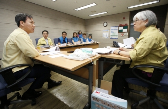 ▲ 김승수 전주시장이 4일 오전 시 간부급 공무원 비상소집회의를 통해 메르스 방역추진대책을 보고 받은 뒤 전주 보건소를 찾아 현장점검에 나섰다. 사진제공=전주시