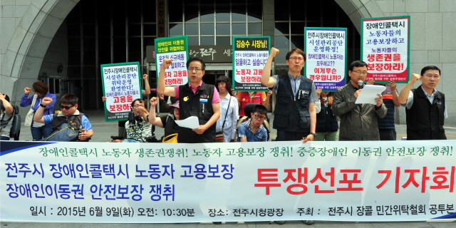 이 단체는 “전주시가 장애인 콜택시 사업만 직영화하고 운전원들의 고용 및 장애인 이동권 문제에 대해서는 외면하고 있다”면서 “장애인 콜택시는 특별운송 차량이기 때문에 자가용이나 택시와는 달리 전문성이 필요하다. 기존 운전원의 고용승계를 통해 장애인 이동권을 보장하라”고 주장했다.