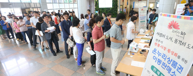 전주시가 중동호흡기증후군(메르스) 여파로 침체된 지역경제를 살리기 위해 2일 시청 로비에 전통시장 온누리상품권 이동판매소를 설치하고 상품권 판매행사를 가졌다.