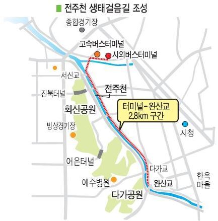 전주시가 천동로(시외버스터미널~완산교)를 끼고 흐르는 전주천 일대를 한옥마을과 연계한 ‘생태걸음길’로 조성한다.