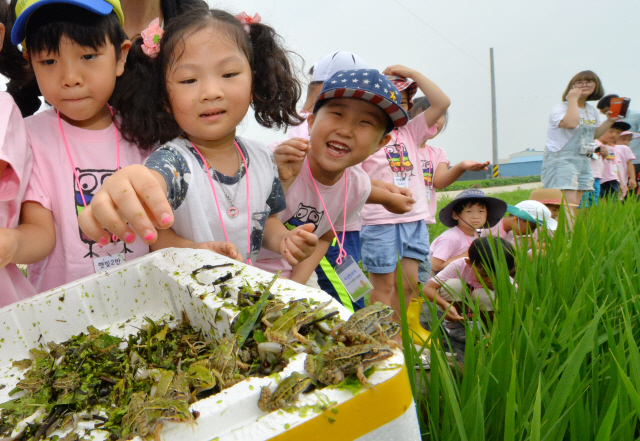 시는 11일 전주 그린유치원 원생 20여명과 친환경 벼 재배농가 등이 참여한 가운데 북부권 친환경 벼 재배단지에 참개구리 2만마리를 풀었다. 이는 농약을 사용하지 않는 친환경 농법으로 벼멸구 등 병충해를 방제하기 위한 것이다.