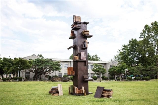딱딱한 동(銅)으로 만든 탑에 부드러운 촉감의 나무로 조각한 완판본이 올려졌다. 금속과 나무를 접목해 각기 다른 물성을 탐구하며 자연과 산업을, 과거와 현재를 연결했다. 3m40㎝ 높이의 책탑에서는 ‘오래된 친구’인 ‘전통·현재·미래’가 만나 책이 되었다.