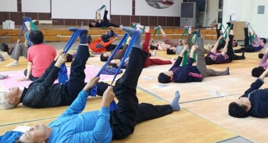 ▲ 순창지역 노인들이 서울대 건강운동과학실이 개발한 근력운동 프로그램을 하고 있다.