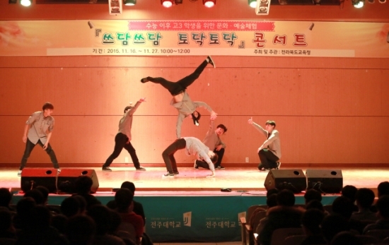 전주문화재단(이사장 직무대행 임환) 역시 다음달 2일까지 고3 학생들을 위한 찾아가는 공연을 마련한다. 이번 공연은 지난 9월 문화재단과 전주교육지원청의 협약을 통해 마련된 프로그램으로 공연을 희망하는 학교 9곳의 신청을 받았다.