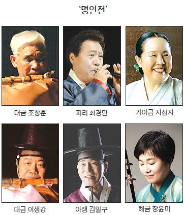 ‘명인전’에는 조창훈(중요무형문화재 제20호 대금정악 보유자), 최경만(서울시 무형문화재 제44호 삼현육각 예능 보유자), 지성자(전라북도무형문화재 제40호 가야금산조 보유자), 이생강(중요무형문화재 제45호 대금산조 예능보유자), 김일구(중요무형문화재 제5호 판소리 적벽가 준보유자) 명인이 초청됐다. 조창훈 명인은 대금독주 ‘청성곡’, 최경만 명인은 피리협주곡 ‘창부타령(박범훈 곡)’, 지성자 명인은 ‘성금연류 가야금산조 협주곡’, 이생강 명인은 대금산조 협주곡 ‘죽향(박환영 편곡)’, 김일구 명인은 ‘김일구류 아쟁산조 협주곡’을 연주한다.