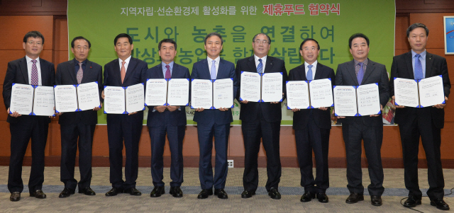▲ 전주시가 지역에서 생산된 농축산물을 지역에서 소비하는 전주푸드플랜 계획을 발표한 가운데 지난 30일 일부 농산물을 인근 군지역에서 구매하는 ‘지역자립 선순환경제 활성화를 위한 제휴푸드 협약식’이 열린 전주시청 회의실에서 전주시와 7개 군 단체장, 유관기관 대표 등이 협약서를 들어보이고 있다. 박형민 기자
