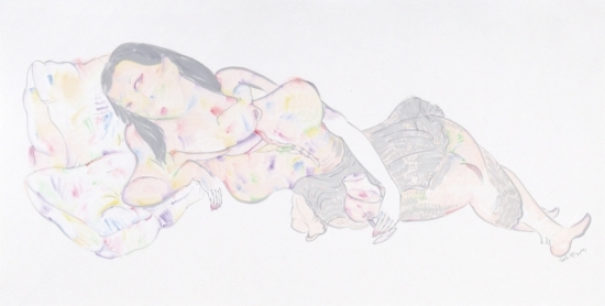 몸은 반추상적인 형태로 재조합되면서 숨은 그림 찾기처럼 숨겨지고 헐거워지고, 생략됐다. 에로틱한 몸짓은 숨겨진 성적 정체성을 보여준다. 먹의 농담과 선의 굵기, 번짐도 미묘하면서도 모호한 중년 여인의 모습을 보여준다. 점과 선, 면이 자연스럽게 어우러지면서 내면에 집중하게 한다. 담묵에 호분을 섞어 부드러움과 우아함, 감정의 기복도 줄였다.