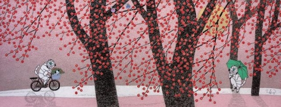 기본적으로 동양화의 형식을 따르고 있지만 유화물감으로 채색한 후 표면에 오일 작업을 더해 화려하고 산뜻한 색감과 경쾌한 분위기를 극대화시켰다.