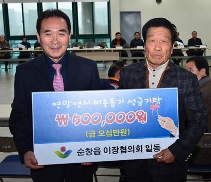 순창군 순창읍 이장협의회(회장 이종복)는 지난 23일 “저소득 소외계층을 위해 써 달라”며 순창읍(읍장 오수환)에 이웃돕기 성금 50만 원을 기탁했다.