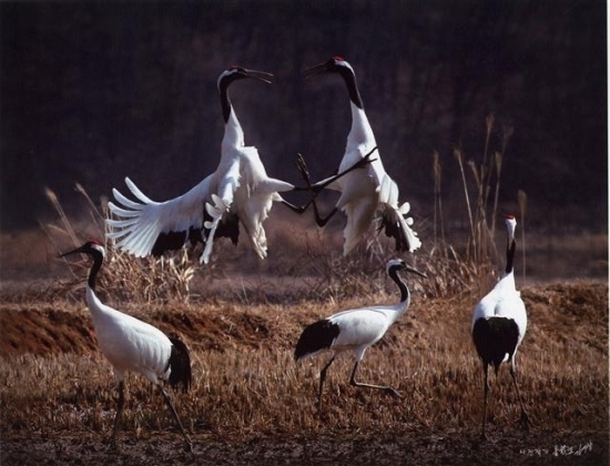 ‘천년의 학 사랑(2)’라는 문패 아래 진행되는 이번 전시는 청정 자연 환경 속 두루미의 다양한 모습을 담은 조류 사진 전시회다. 작가는 영하 30~35도가 넘나드는 추위 속에서 짚단을 쌓고 움막에 기거하며 두루미를 관찰, 촬영했다.
