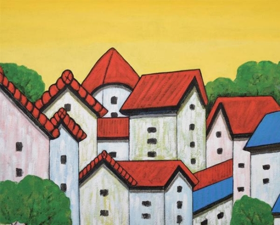천공, 바다, 산 등을 그림자를 제거해 입체성보다는 단순한 색·면 구성 형식에 가깝다. 다만, 빼곡이 그려진 집들이 오늘날 우리 주변의 일상 풍경을 그린 것임을 보여준다.
