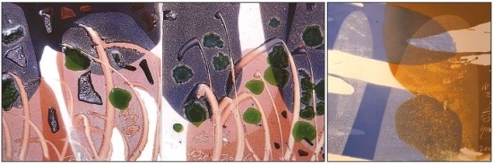 또한 토속적인 재료에 은은한 먹색과 적색, 녹색 등의 색채가 가미돼 다채로운 느낌을 준다. 색유리 조각을 녹여서 입체감과 다양한 형태감을 표현했다. 김 작가는 “이번 전시에서 선보이는 도판화는 터키에서 학생들을 가르칠 당시 작업한 것들이다”며, “그 나라의 유약과 흙을 쓰다 보니 이국적인 느낌이 날 수 있다”고 말했다.