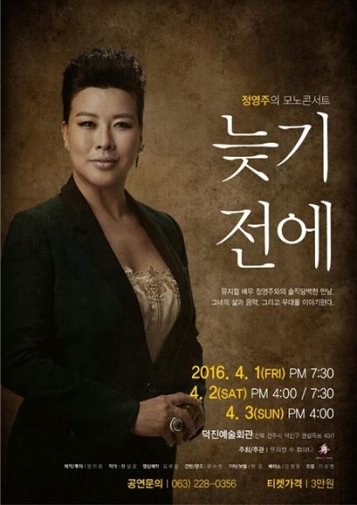 (유)뮤지컬 수 컴퍼니는 다음달 1일부터 3일까지 전주 덕진예술회관에서 정영주 단독 토크콘서트 ‘늦기 전에’를 개최한다.