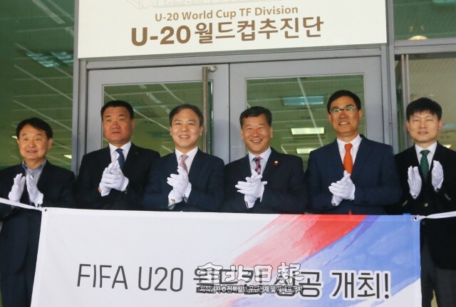 전주시는 29일 전주월드컵경기장에서 김승수 시장과 박현규 시의회 의장, 김대은 전라북도축구협회장을 비롯한 대회 관계자가 참석한 가운데 ‘전주시 U-20월드컵추진단’사무실 현판식을 가졌다.