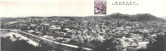 1930년대 전반 사진으로 추정되는 ‘전주시가전경’은 전주부로 분리승격되기전인 전주군 전주읍의 모습을 담은 자료다. 상단에 ‘제20사단 추계연습숙영지’라고 쓰여 있는데, 두장을 접어놓은 형태의 엽서사진으로 전동성당 일원에서 다가교 너머까지의 전주 시가지 전경을 담고 있다.
