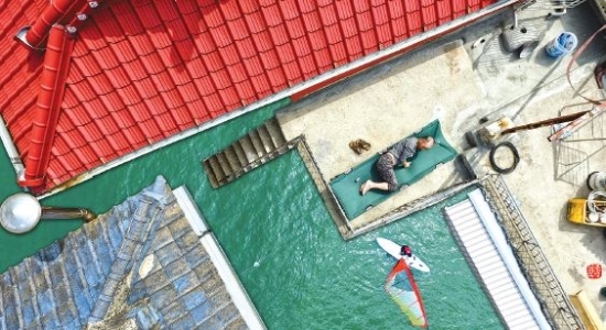 빨간 지붕 꼭대기와 초록 강물, 낮잠을 즐기는 남자의 실루엣이 한 눈에 보인다. 전북의 풍경을 하늘에서 내려다본 듯한 사진작품이 전시된다. 전북 산하를 드론으로 촬영해온 사진작가 곽풍영씨가 세 번째 개인전 ‘하늘을 산책하다’를 연다. 오는 31일까지 전주 사진공간 눈.