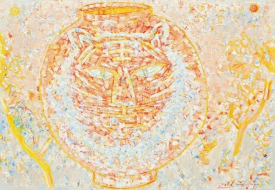 작가는 달항아리를 밝은 색깔과 단순한 형태로 표현한다. 세부묘사와 명암을 최소화하고 나이프를 사용해 울퉁불퉁한 재질감을 극대화한다. 여기에 해와 달, 호랑이, 매화, 꽃 등 민화적 소재가 더해졌다.