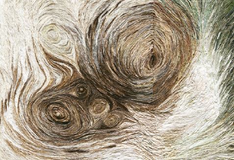 작가는 자유롭게 떠도는 많은 생각을 붙잡고, 자신만의 언어를 만들기 위해 많은 공력을 요구하는 방식을 선택했다. 자연스러운 조형미를 위해 닥섬유 비율이 다른 여러 한지를 골랐고, 염색과 태움, 밀도도 달리했다. 여러겹의 한지가 만들어낸 선의 조형성이 생명에너지로 변환됐으며, 작가의 내면세계를 드러냈다.