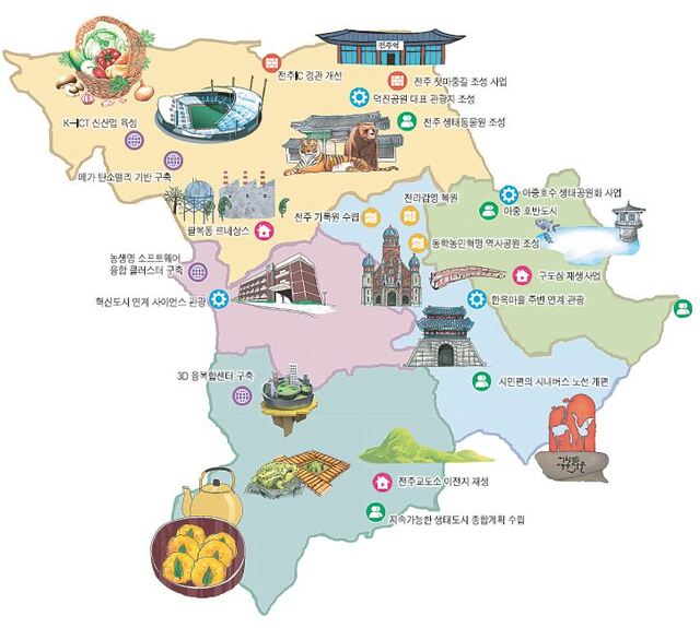 원도심 - 전라감영 복원, 전통문화 중심 활기 회복 / 동부권역 - 아중 호반도시 건설 통한 생태 중심지로 / 덕진권역 - 동물원·덕진공원 등 연계 관광벨트 조성 / 북부권역 - 팔복동 철길옆 금학천 정비 명소화 / 서·남부권역 - 주민편의시설 확충 정주여건 개선