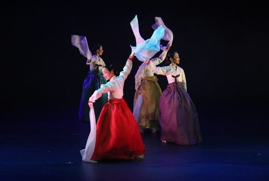 이윤경 백인숙 김윤하 이윤서 김혜진 단원은 여인들이 쉽게 지닐 수 있는 목수건 손수건 머릿수건 등을 활용해 멋스러운 몸짓을 선보이는 ‘흥푸리’를 춘다.