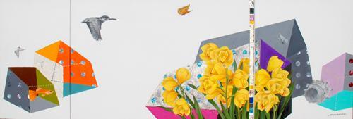 작가는 이번 전시에서 순환하는 자연을 주제로 화병과 새, 나비를 정물화형식으로 제작한 ‘공감-채집’ 연작 20여 점을 전시한다. 작품은 한국화 채색기법을 사용해 천에 광택이 없는 물감인 아크릴과슈나 자개, 은박 등 혼합재료를 덧대 제작했다.