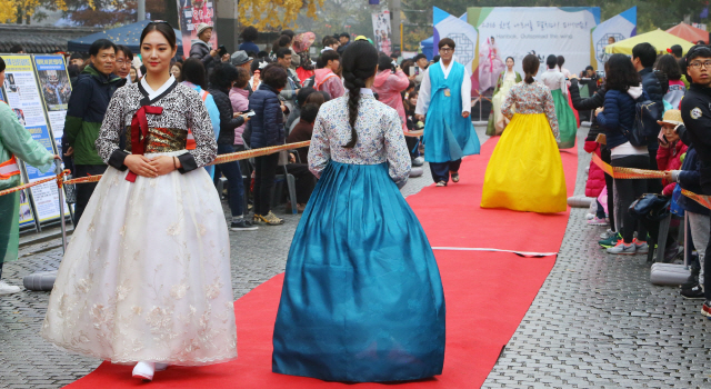 처음 열린 이날 거리패션쇼에서는 모델들이 왕실복과 전통혼례, 신 한복 등 전통과 멋이 담긴 한복을 입고 소개했다.