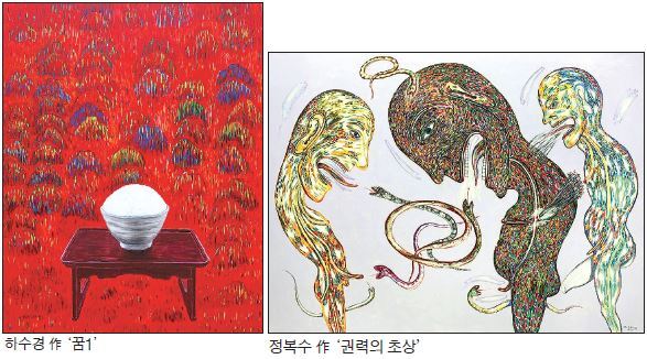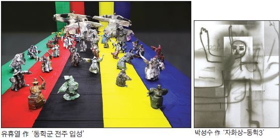 올해 금보성아트센터 한국작가상을 수상한 유휴열 작가는 동학군의 전주입성을 자축하는 설치작품을 선보인다. 오방색 천위를 나부끼는 민초들의 신명나는 춤사위는 못다 이룬 동학농민군의 꿈과 애통함을 달래주는 듯하다. 한국민족예술인총연합 전북지회장을 지냈던 송만규 미술가는 끊이지 않고 흐르는 강물과 같은 겨레의 힘과 마침내 도달할 통일의 열망을 천지(天地)로 형상화했다.