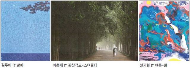 이흥재 작가는 올 여름 소낙비가 내리던 풍경을 촬영했다. 시원한 대지와 자연의 힘을 표현한 것이다. 사진을 사진인화용 한지에 인화해 반짝거림 없이 다른 그림들과 어우러지도록 했다.