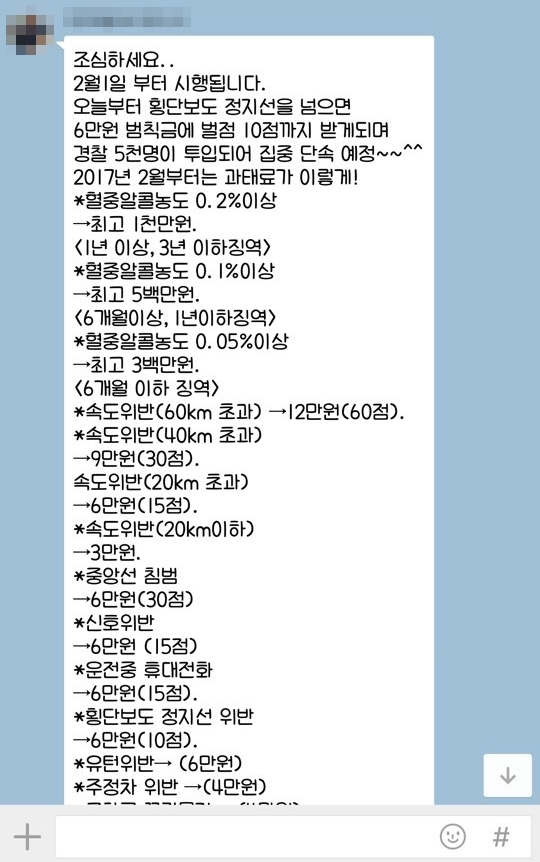 전북지역 모 중소기업 부장 강모 씨(50)가 지난 31일 카카오톡 단체 대화방에 지인으로 부터 받은 글을 전달하자 부서원들이 들썩거렸다. 경찰이 2017년 2월부터는 생활법규를 위반하면 범칙금과 벌점을 상향하고, 특히 1일부터 경력 5000명을 투입한 집중 단속을 펼친다는 내용이었기 때문이다.