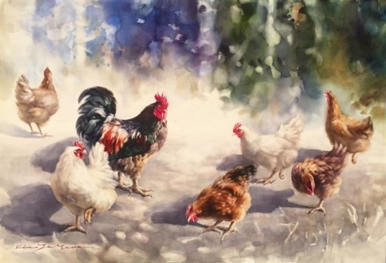 그는 주로 마음에 품어온 고향 풍경을 그려왔는데 이번 전시에서는 닭을 소재로 한 풍경화를 다수 선보인다. 세밀한 붓질로 그린 닭의 날개와 벼슬, 발톱은 생동감을 일으키지만, 물을 잔뜩 머금은 배경에서는 부드럽고 풍부한 수채화 감성을 느낄 수 있다.