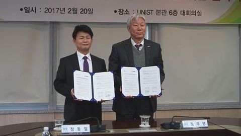 ▲ 20일 정동철 한국탄소융합기술원장(왼쪽)과 정무영 울산과기원 총장이 협약서를 들고 기념사진을 찍고 있다.