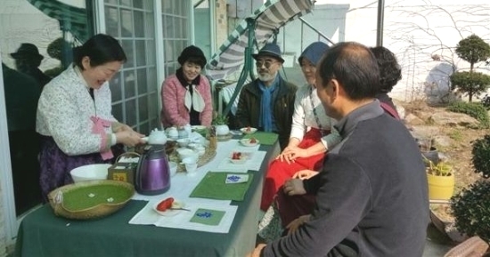 ▲ 작업실 ‘비파채’에서 조경우 예술인이 방문객들과 다도를 하고 있다.