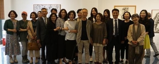 ▲ 이철량 전북대 명예교수(앞줄 오른쪽 네번째)가 제자들이 마련한 회고전 ‘우리시대의 먹그림’이 열리는 전주 누벨백미술관에서 전국에서 모인 제자 및 동료들과 기념 사진을 찍고 있다.